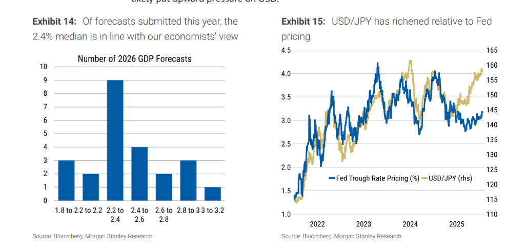 大摩对外汇市场的看法经历了修正。此前他们认为美国经济将在2026年初走弱从而拖累美元,但现在的经济数据显示美国增长强劲(2026年GDP增速预期上调至2.4%),且美联储降息时间推迟(从1月推迟至6月和9月)。